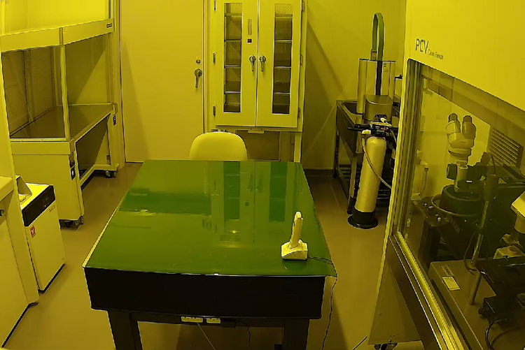 材料を作ったり評価をしたりする部屋です。1500℃で試料が焼ける電気炉、薄膜試料を作る装置と微小電圧(0.000000001V)や微少電流(0.0000000000001A)で各種電気的特性を評価できる装置、照明が黄色いクリーンルーム(空気中の塵が極端に少ない部屋)があります。