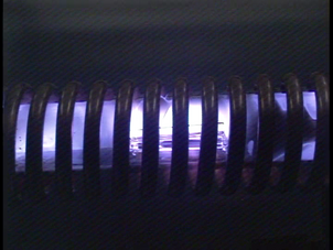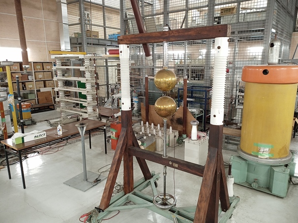 高電圧実験室は、普段の生活ではまず出会わないほど高い電圧を取り扱うことが出来る実験室です。簡単に言うと雷を起こすことのできる実験室です。安全に実験を行えるように、実験装置は金網で囲われています。現在は約5万ボルトの電圧で実験ができます。