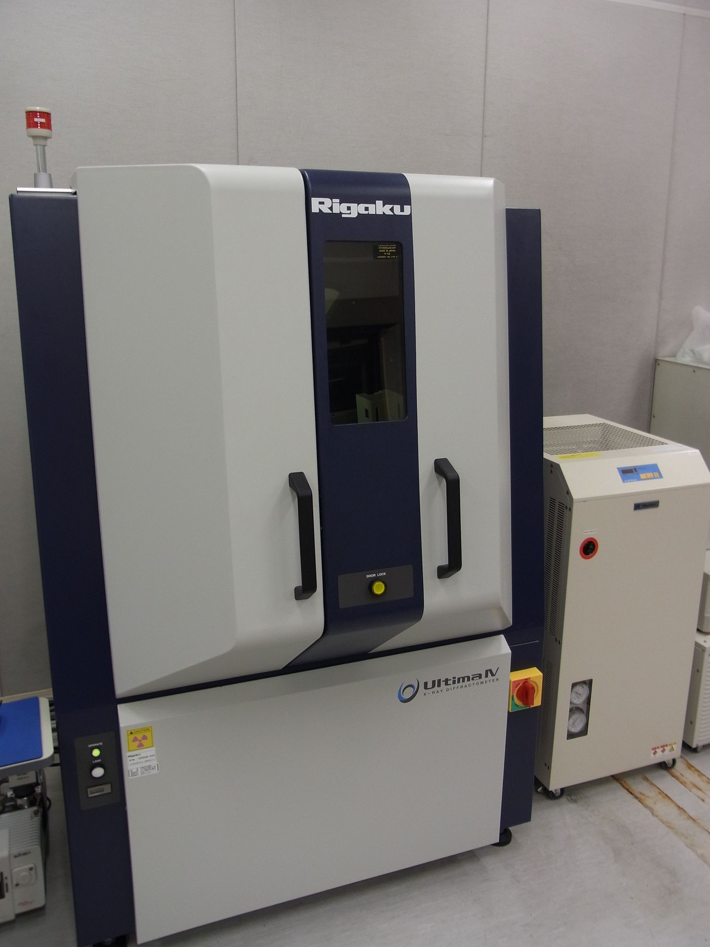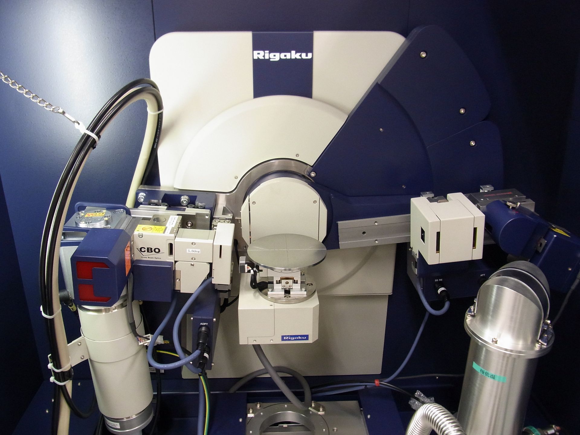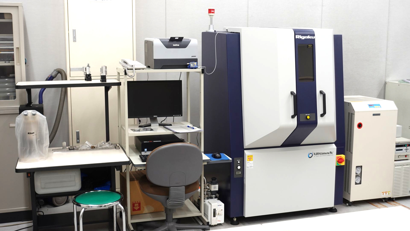 結晶の構造を測定するための装置(粉末X線回折装置)が置かれています。X線を試料に照射すると、試料の原子によってX線は向きを変えます。このX線を分析すると、原子レベルの試料の構造がわかります。よって、分析結果から、自分で作った試料が目的の物質になっているかを確かめることができます。