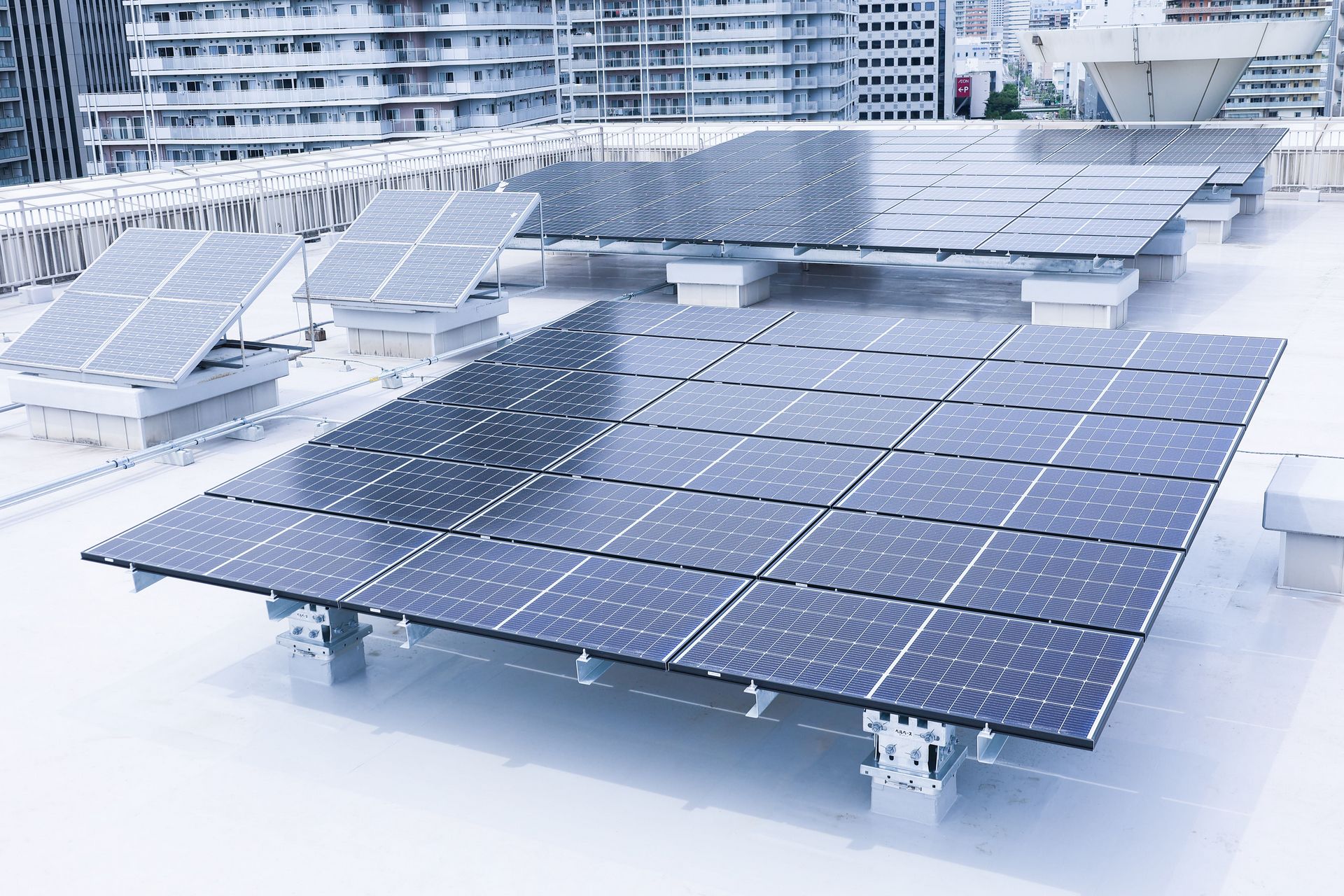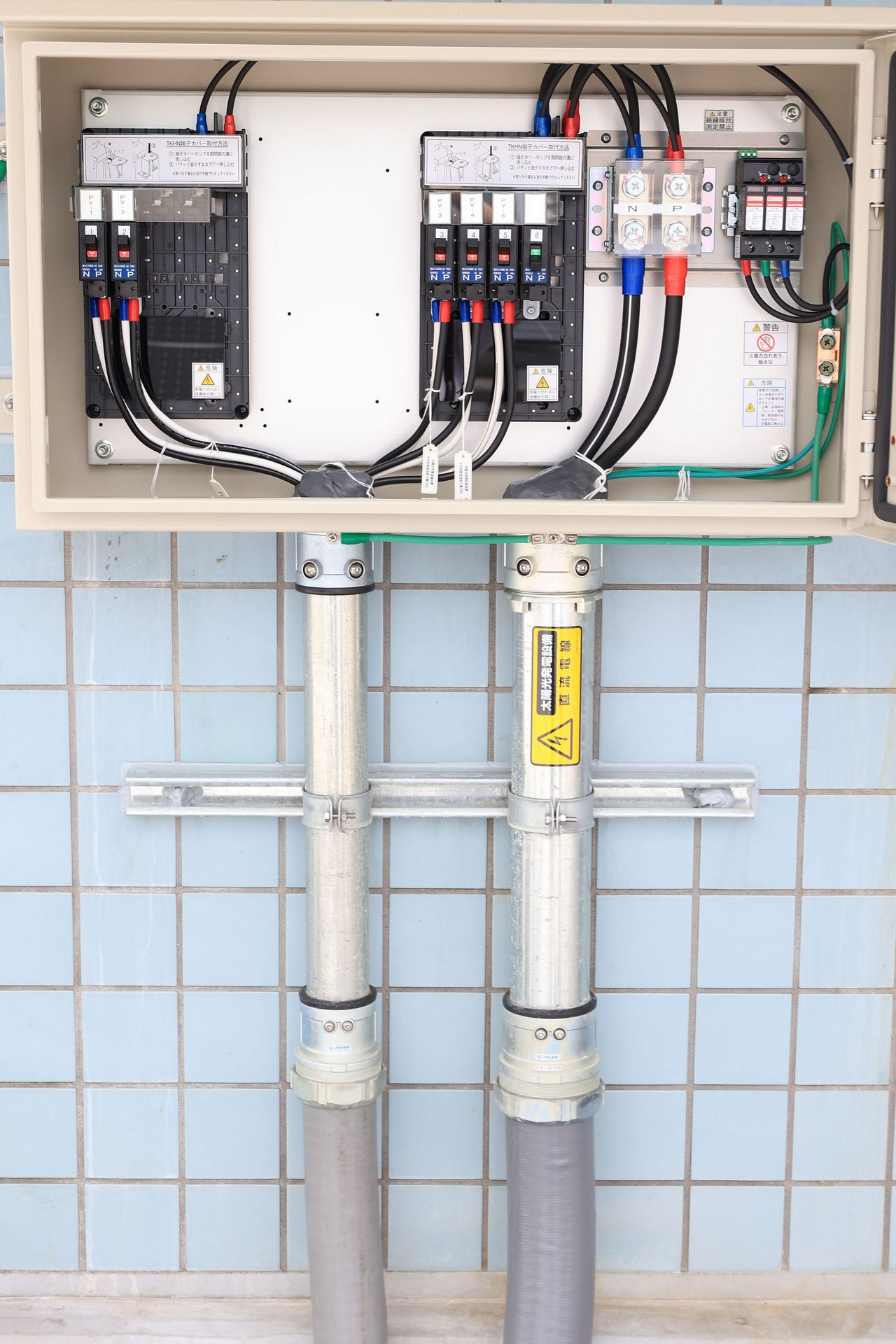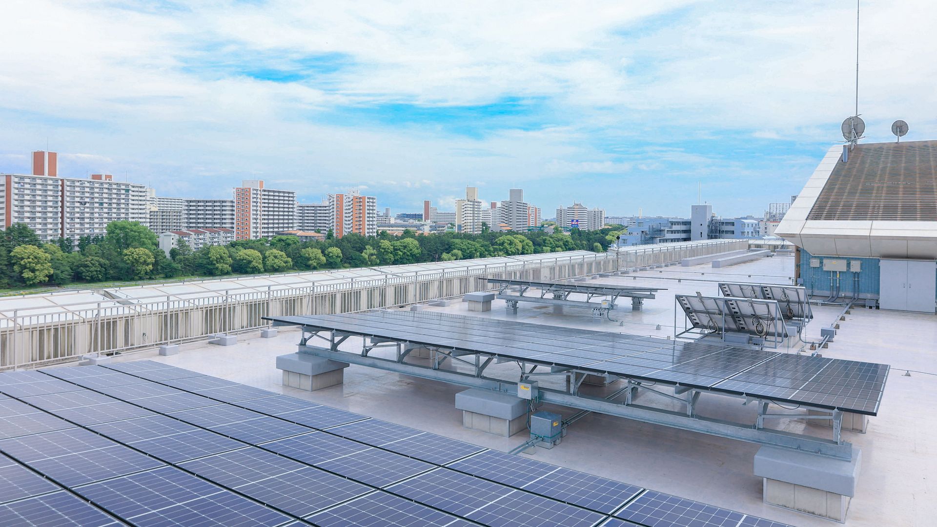 東棟の屋上には、太陽電池と日射計が設置されています。これらの機器を用いて、発電電力と日射強度などのデータが常に計測されています。蓄積したデータは卒業研究(発電量予測や故障診断の研究など)で活用されています。電気通信部がアマチュア無線コンテストのときに大きなアンテナを立てる場所としても使われます。