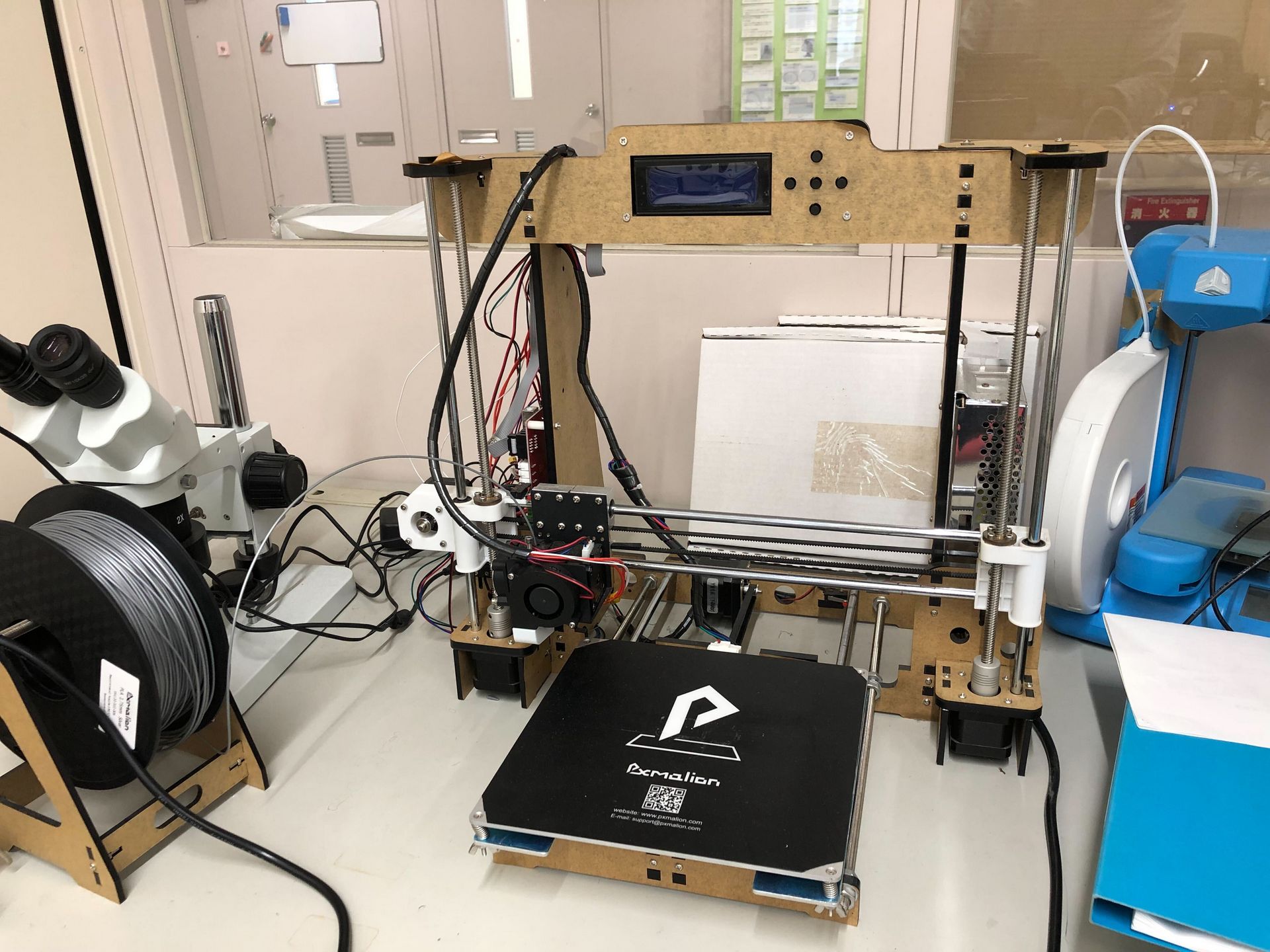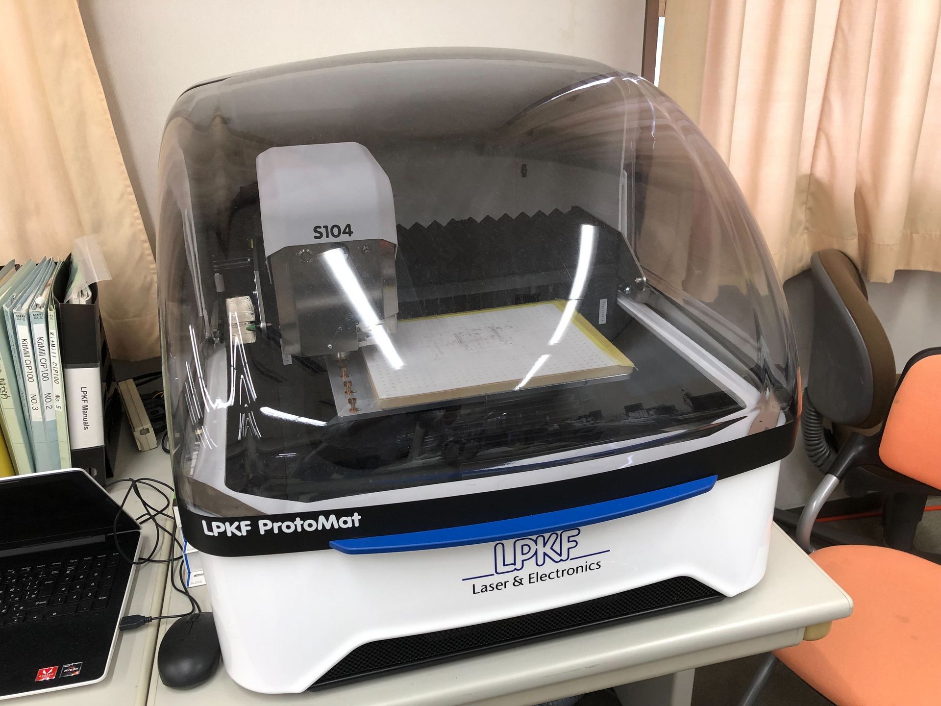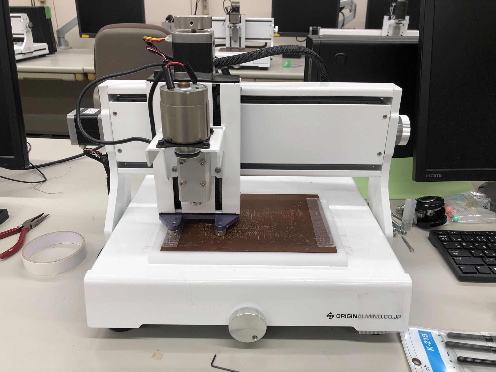 この部屋では、自分で設計した回路や造形物を製作することができます。基板加工機(LPKF、KitMill)、3Dプリンタ(Pxmalion社製)が備えられています。また、上級生(Student Assistant)によるワークショップ(マイコンの使い方など)が行われる会場にもなります。放課後は開放されている部屋です。