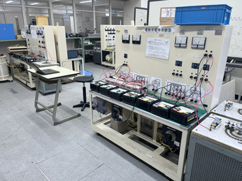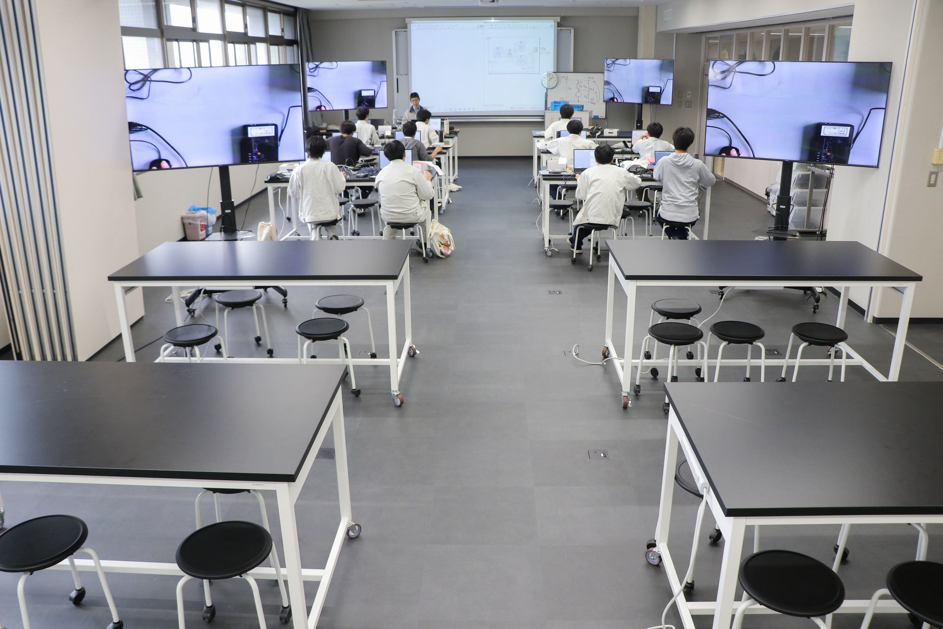 この部屋では、計測、試験、検査を行うことができます。モノを作った後に、その評価を行い問題点を見つけ、その原因をつきとめる部屋です。 一クラス全員を収容でき、太陽電池で充電されたバッテリーで駆動される大型モニターが4台設置されています。電気工事士・電験3種の補講などにも利用されています。