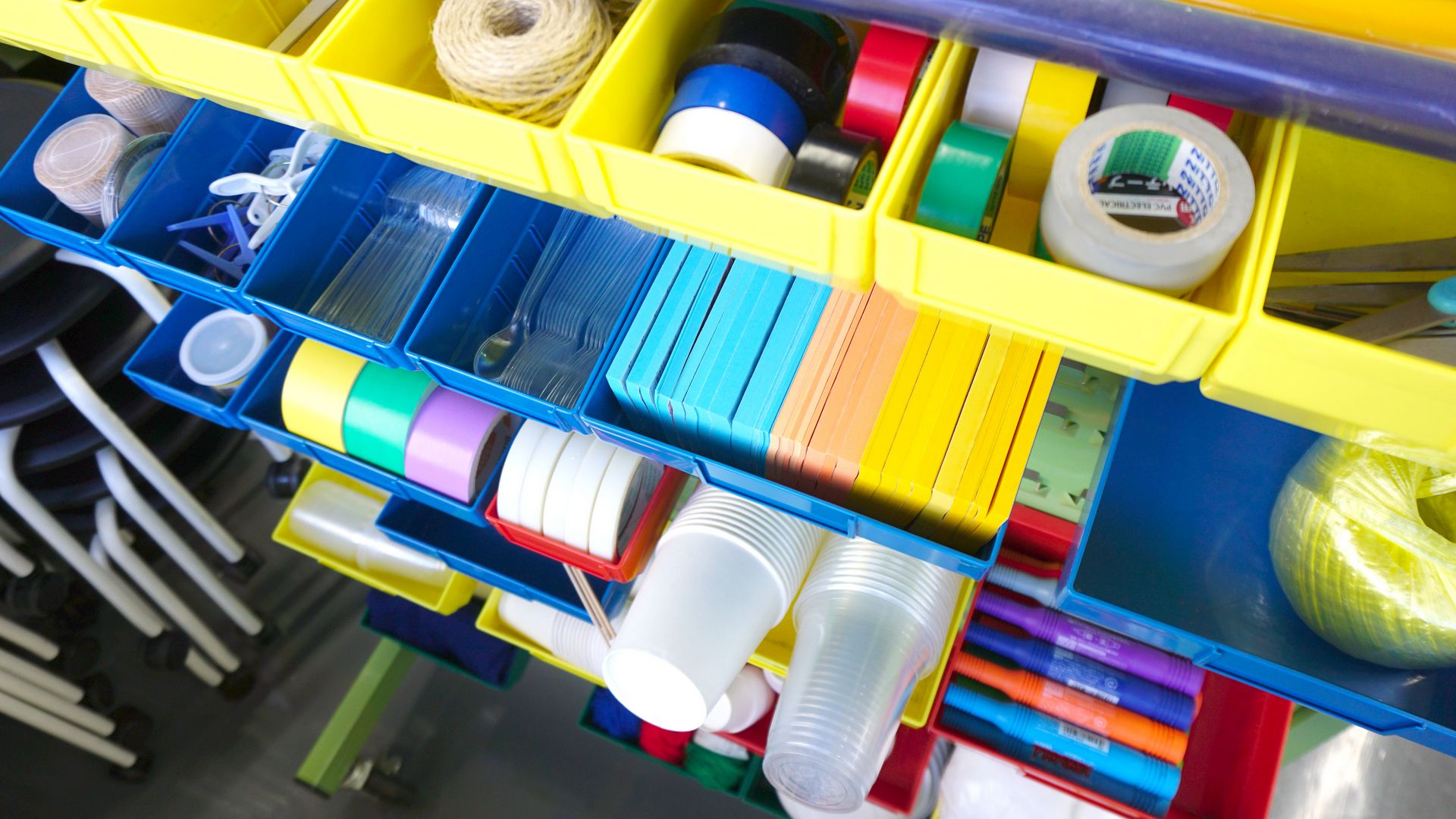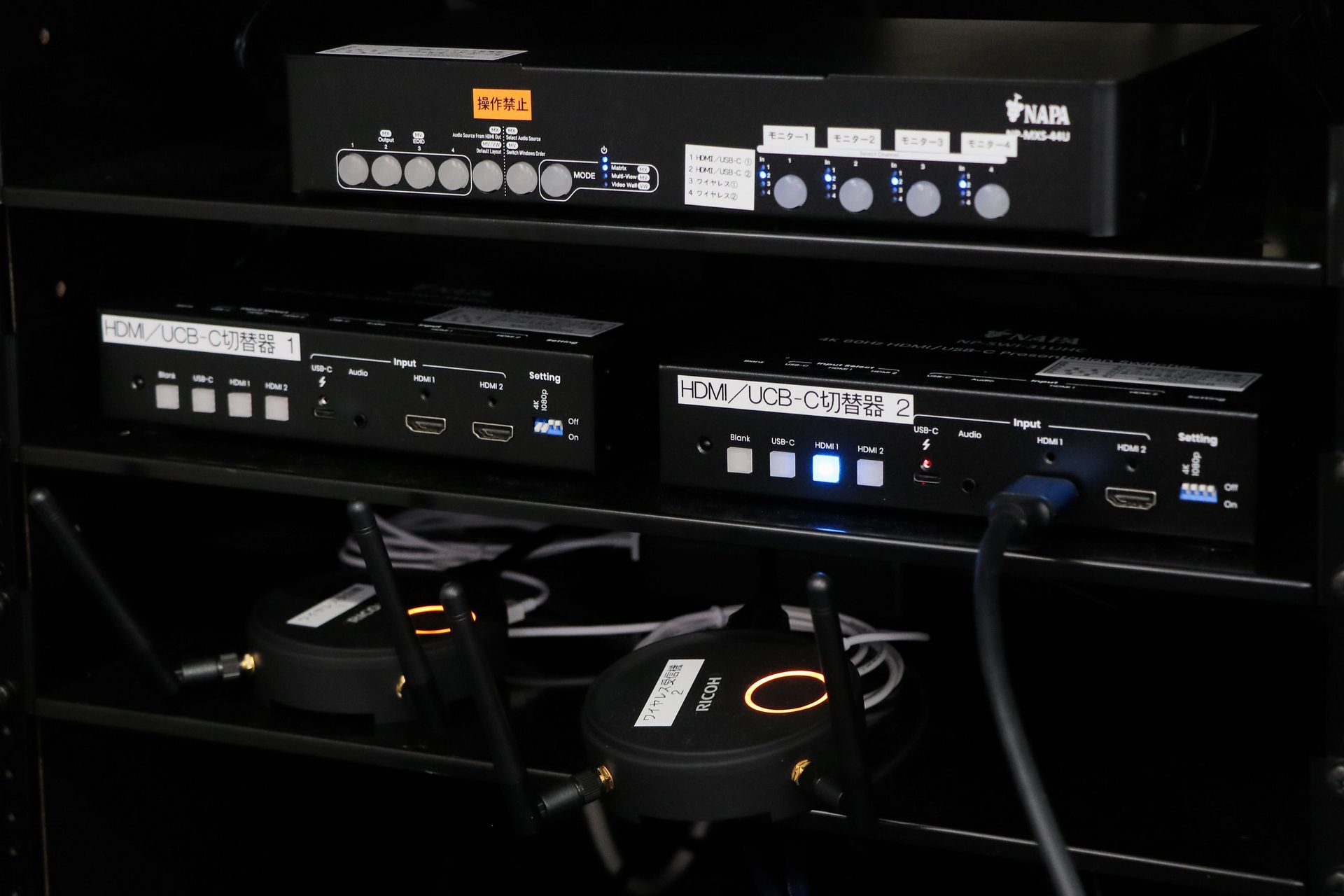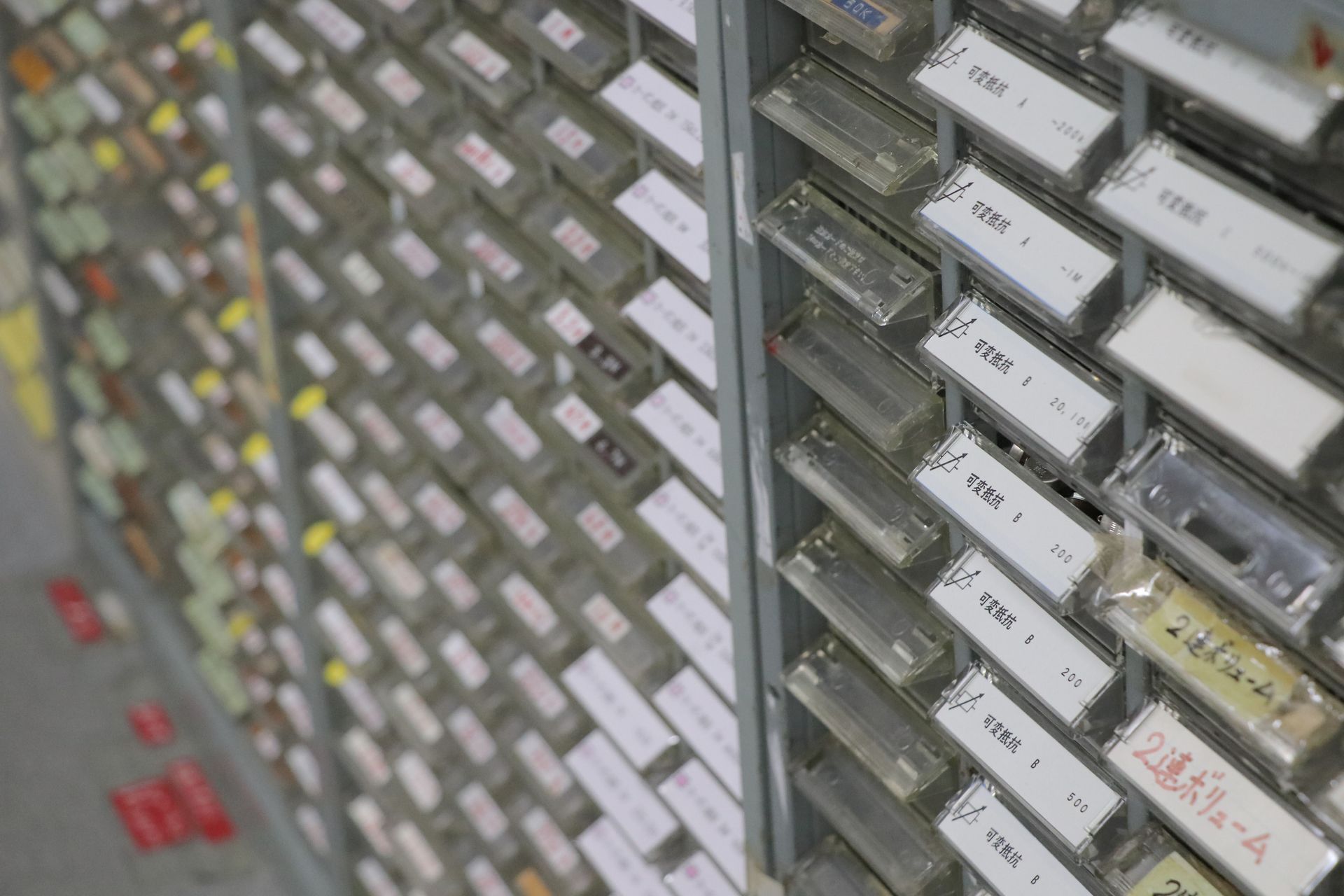 この部屋は電気電子回路に必要な素子(抵抗、キャパシタ、インダクタ、74HCシリーズ、オペアンプなど)や、計測機器などが置いてあるウェアハウスです。申請書類を提出するだけで、卒業研究、授業、コンテストなどで必要な器材を、即時に入手できます。また、太陽電池に接続された蓄電池も配置されています。