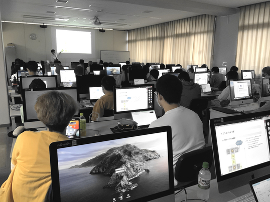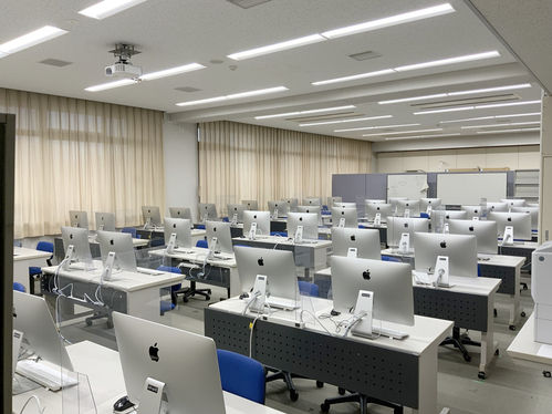この部屋にはiMac48台が設置されています。プログラミング用エディタ VS code、回路設計用 CAD ソフト EAGLE、シミュレーションソフト MATLAB、レポート執筆用 MS office と TeX などのソフトウェアがインストールされています。授業に利用されているだけでなく、放課後に学生へ開放もされています。