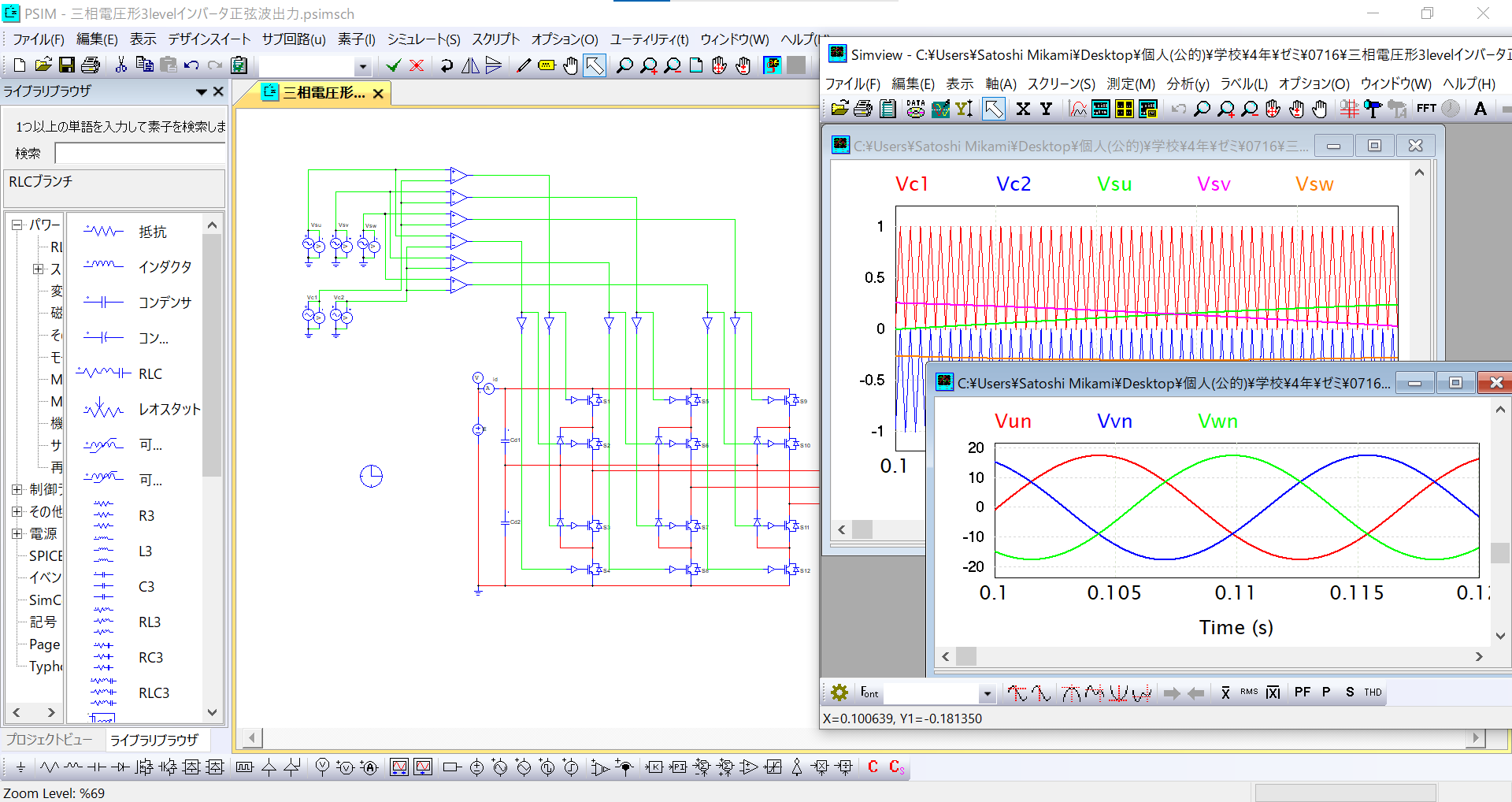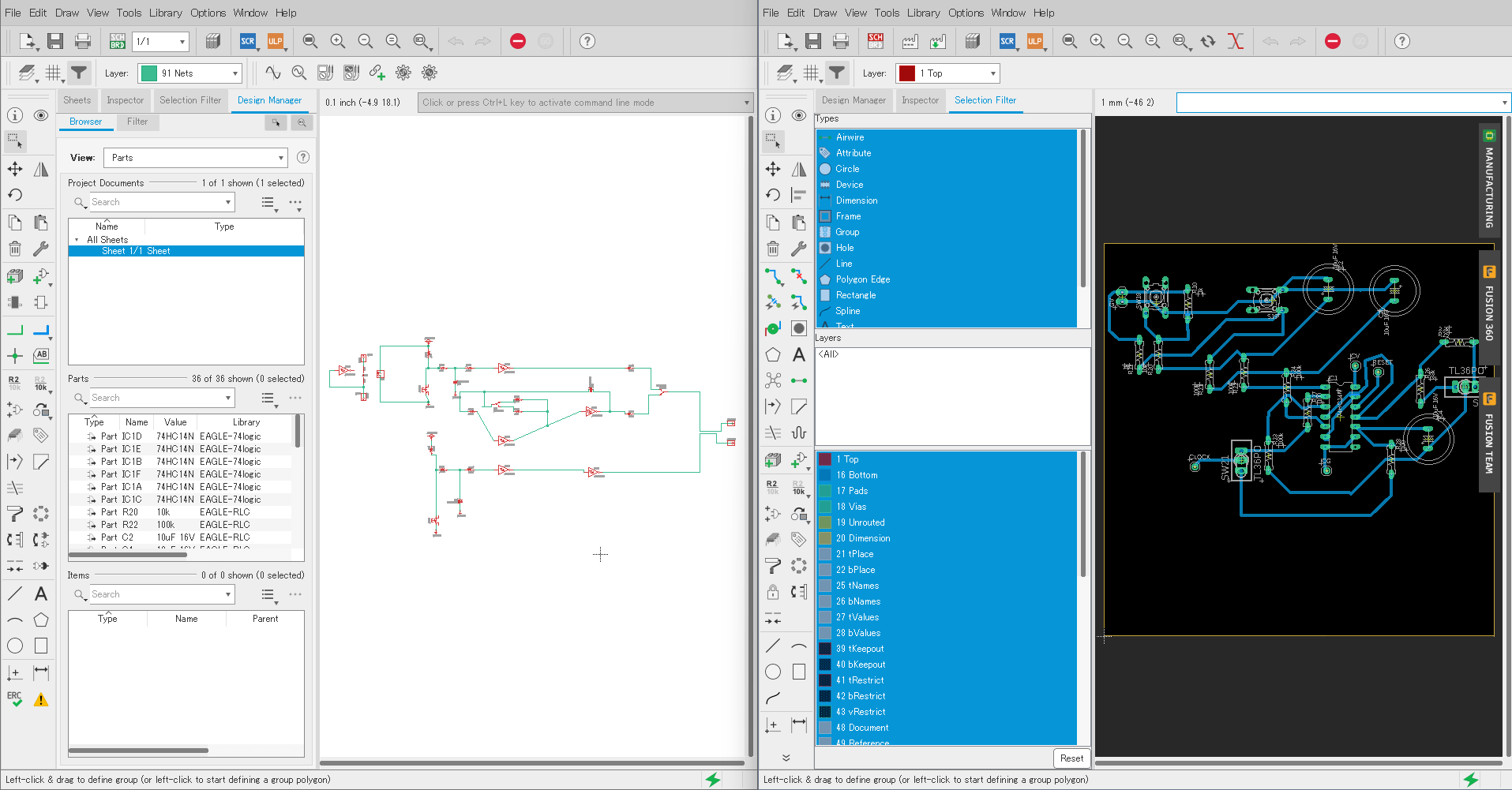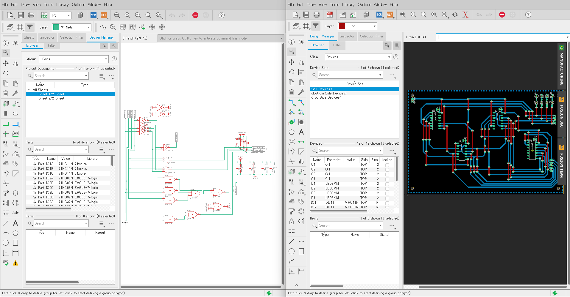 電気電子エネルギー工学コースでは EAGLE (Autodesk Fusion) を用いて回路設計を行っています。回路図上での素子と素子の接続から始まり、実際の基板への素子や端子のレイアウトを行えます。デザインチェック、電気的接続チェックはソフトウェアが行ってくれます。