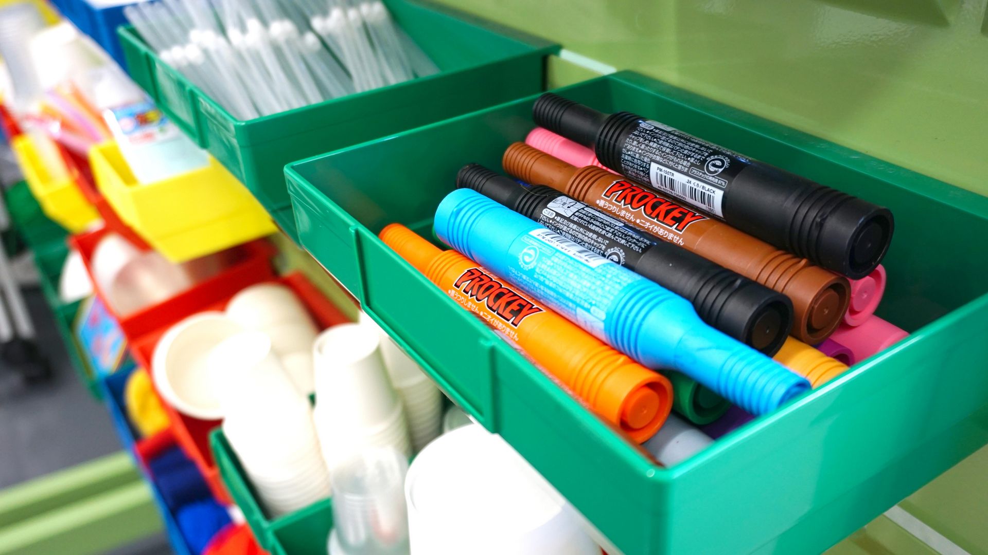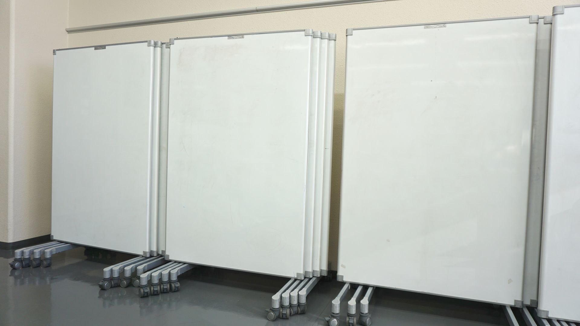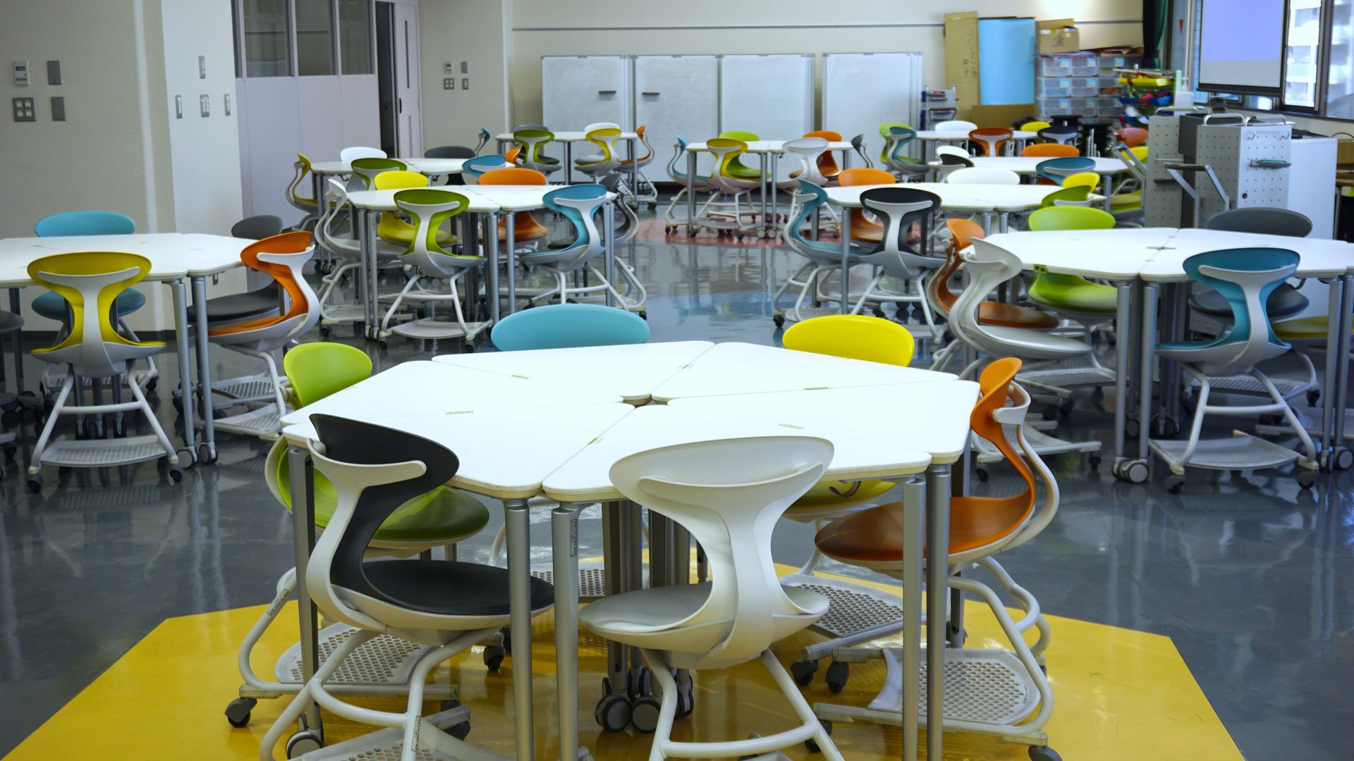 この部屋ではワークショップ形式の授業が行われます。このため、可動式ホワイトボード、可動式プロジェクタ、付箋、(クイック&ダーティ)プロトタイピング用資材がたくさん置いてあります。普通教室の倍の面積に六角形机を配置してあるため、チームでの活発な議論をするのに適しています。