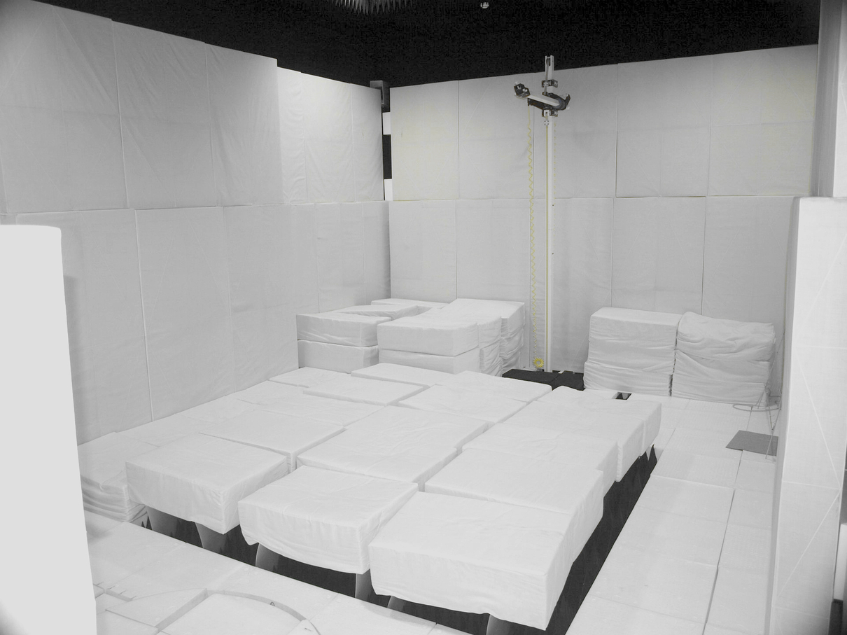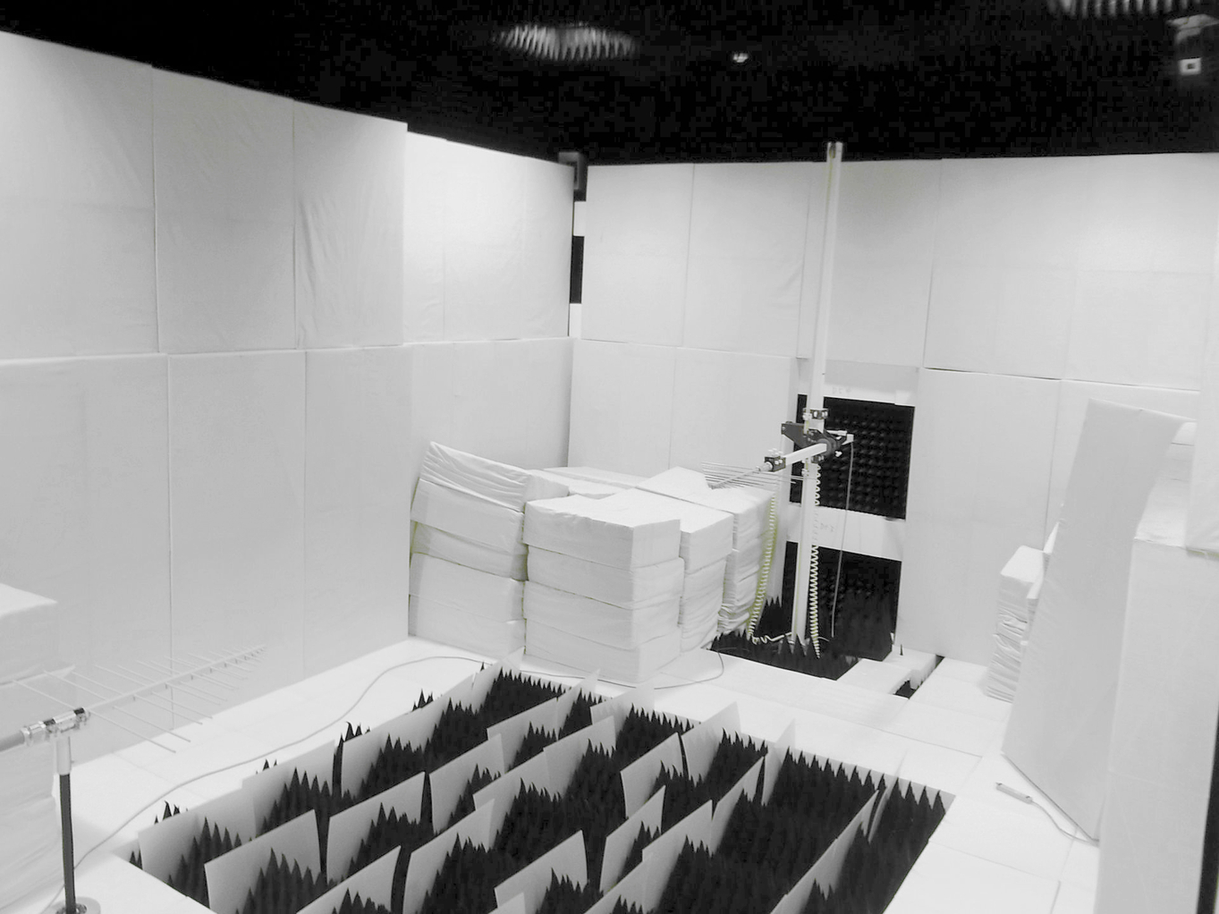 アンテナの性能を測るための特殊な部屋です。黒いトゲトゲ(電波吸収体)を壁・天井・床全面に設置し、電磁波からは擬似的に無限に広い空間に見えています。この電波暗室では3m法と呼ばれる性能評価試験が可能です。この部屋は無響室(音の反射のない部屋)としても使えます。写真の白いクッションは音波吸収体です。