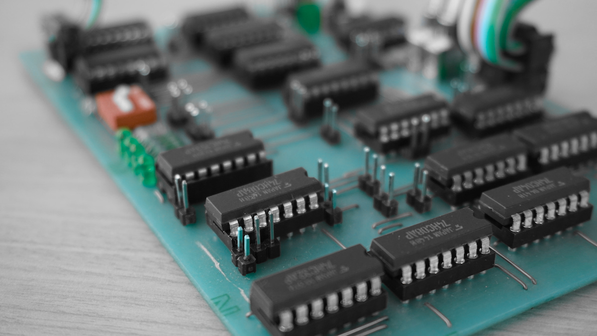 4年の学修単位科目コンピュータ工学Ⅰでは4ビットCPUを設計製作しています。CPUの動作原理と構造を学んだ後、独自命令2つ以上を加えたオリジナルCPUを設計製作し、実際に動作させます。具体的には、3名1チームで、まず、CPUの全体構造と各回路の入出力を決め、論理回路シミュレータで動作確認をします。次に、各人が担当する回路について回路設計用CADソフトで基板レイアウトを行います。続いて、基板加工機で基板を作成し、ICソケット等の部品をはんだ付けします。最後に回路テストを行います。でも一発ではまず動きません。ここからが本番、真の最終ステップであるデバッグを行います。問題症状を観測したら、設計や実装をよくチェックし原因を洗い出します。原因に対して適切な解決策を選んで、問題を解消します。VccやGNDをレイアウトし忘れたり、基板加工機の刃を折ったり、メンバー間で衝突したり、ついに正常動作しみんなでガッツポーズしたり、様々な体験をしながらCPUの完成を目指します。