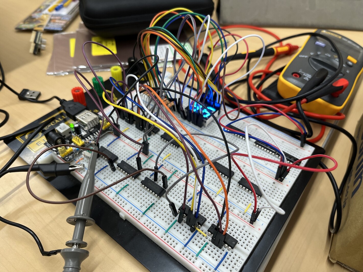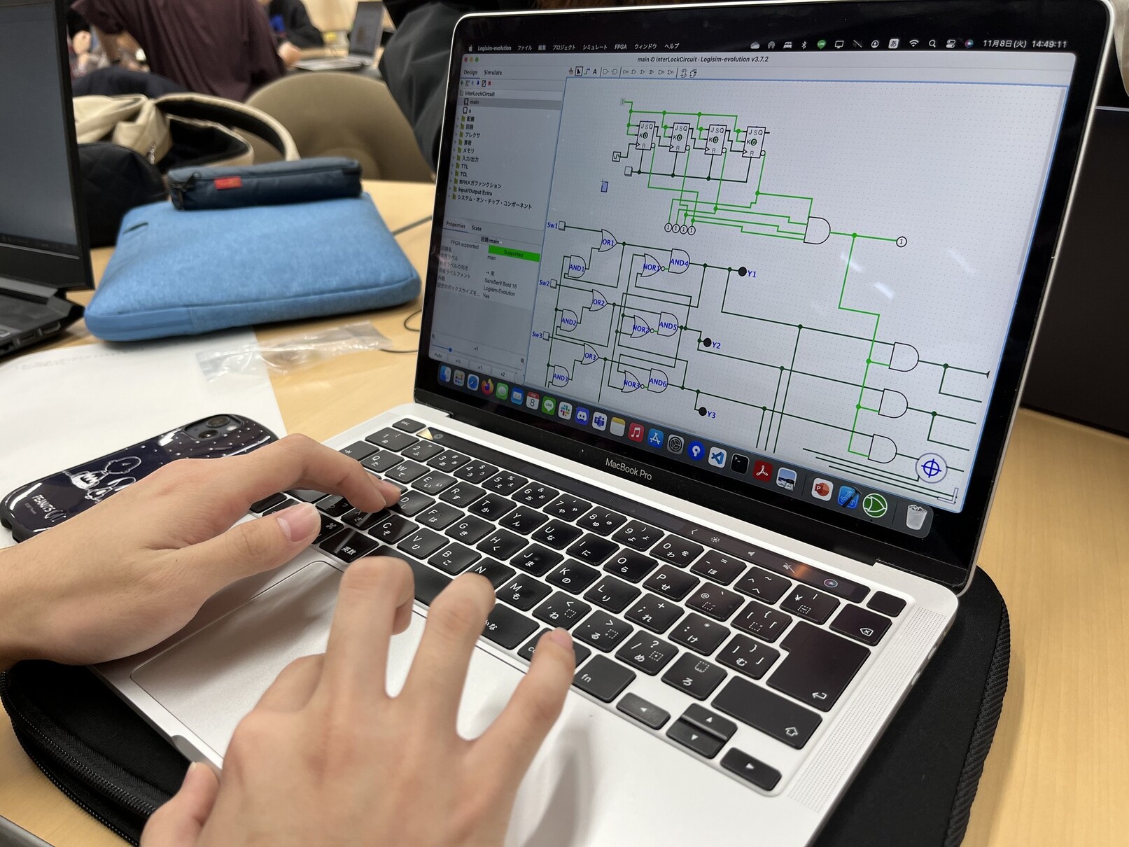 2年の電子回路Ⅰでは、ディジタル回路を含むものなら何でもOKというお題で、チームでものづくりを体験します。教科書で学んだ汎用論理 IC(74HCシリーズ)や論理回路設計の知識を活用することが目的の一つです。メンバーで何を作るかアイディアを出し、機能を実現するための回路を調査・考案・設計し、logisim を用いてシミュレーションをした後に、実際の回路を製作していきます。望む機能を回路にするとどの程度の規模になるのか(サイズ、集積度、基板枚数、複雑さ)、実際に作るのにどのくらいの時間がかかるのか(スケジュール管理、タスク管理)、授業を聞いているだけでは身につかないものづくりの感覚を養うことがもう一つの目的です。知識を知っているだけにとどまらず、知識をどんどん使っていきましょう。