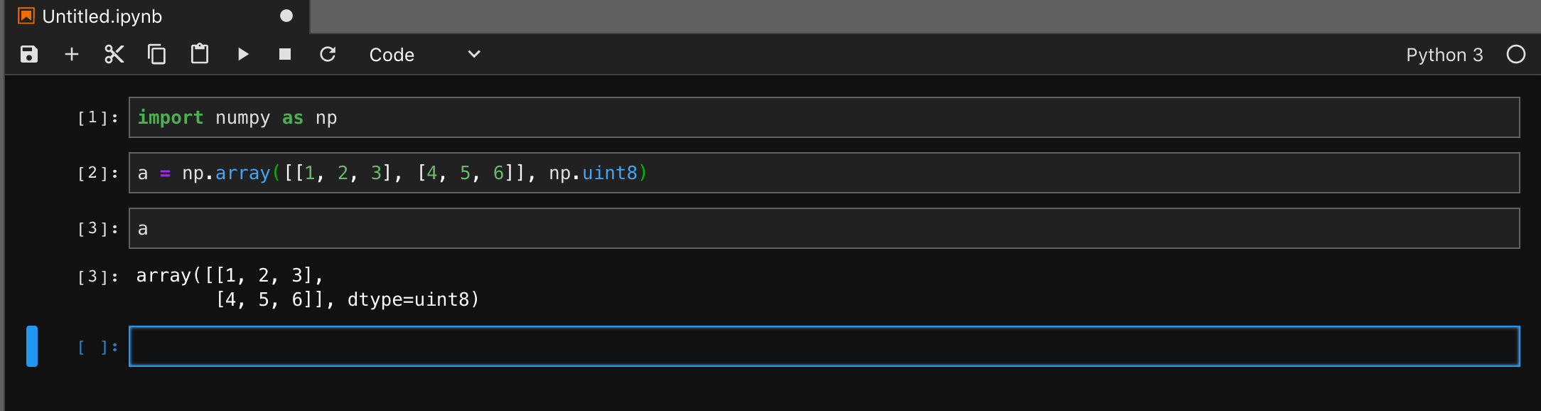 Safari 以外のブラウザで http://localhost:8888/ にアクセスする.もしポート番号を変えたければ,上記の jupyter_notebook_config.py に設定する.Notebook を開くと以下のような画面になる.IPython の実行結果がセルとして残されていく.