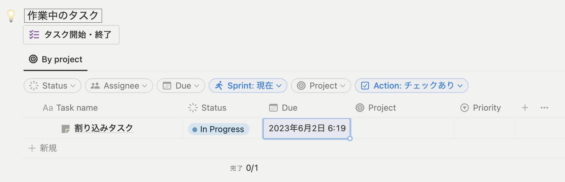 もっとも大変そうだと思った割り込みタスクですが、発想の転換でいいアイディアを思いつきました。スプリントで作業全体が見やすくなったものの、現在自分が行なっている作業を探すのが面倒です。そこで、次のような「作業中のタスク」というコールアウトを作りました。ここには、先ほどの開始・終了タスクボタンと共に、現在のスプリントでかつ Action にチェックが入っているタスクが表示されます。