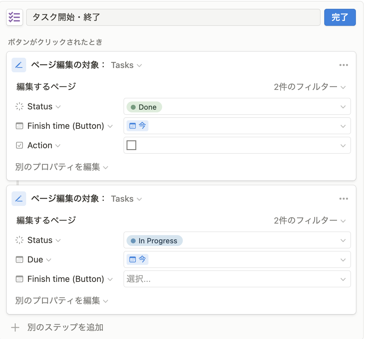 これらのプロパティを用いて、まずはボタンを修正します。とりあえずボタンを複製して、最初のタスク終了のアクションを修正します。
